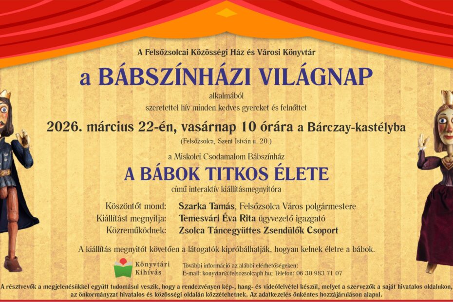 A Felsőzsolcai Közösségi Ház és Városi Könyvtár szeretettel hívja és várja az érdeklődőket a Bábszínházi világnap alkalmából 2026. március 22-én, vasárnap 10 órakor kezdődő „A bábok titkos élete” című kiállításmegnyitóra a Bárczay-kastélyba.