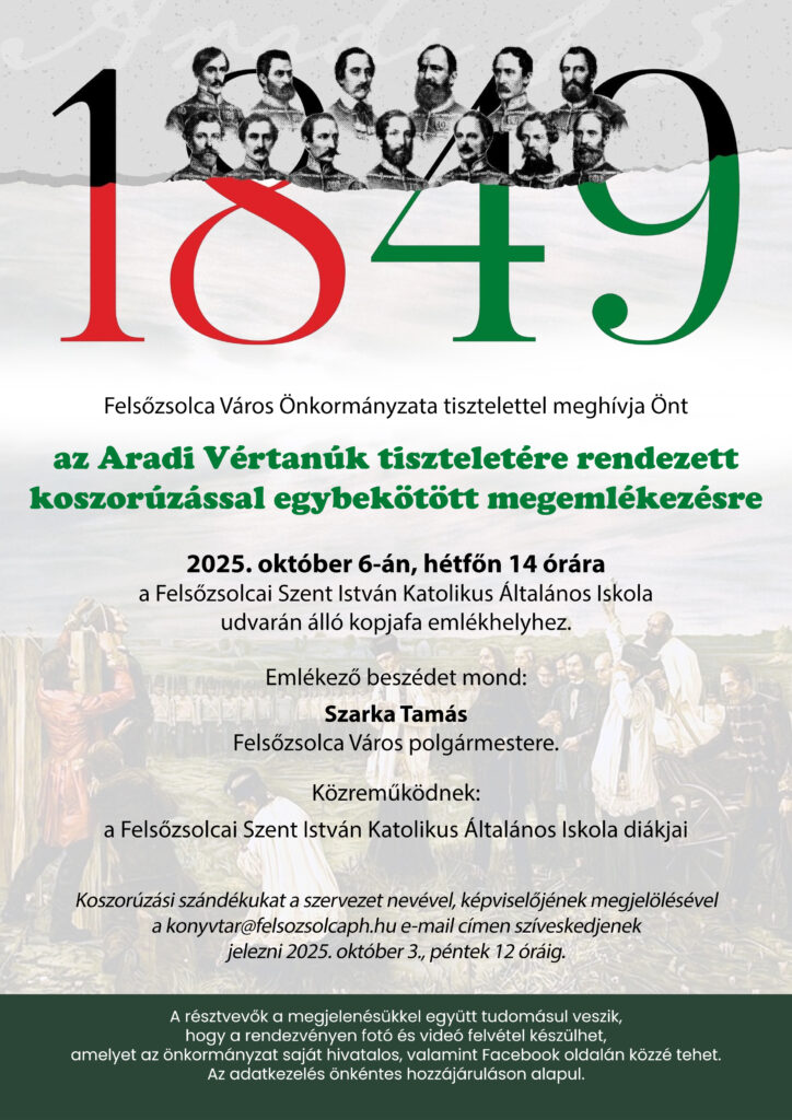 Koszorúzási szándékát a szervezet nevével, képviselőjének megjelölésével kérjük, hogy a konyvtar@felsozsolcaph.hu e-mail címen szíveskedjen jelezni 2025. október 3., péntek 12 óráig.