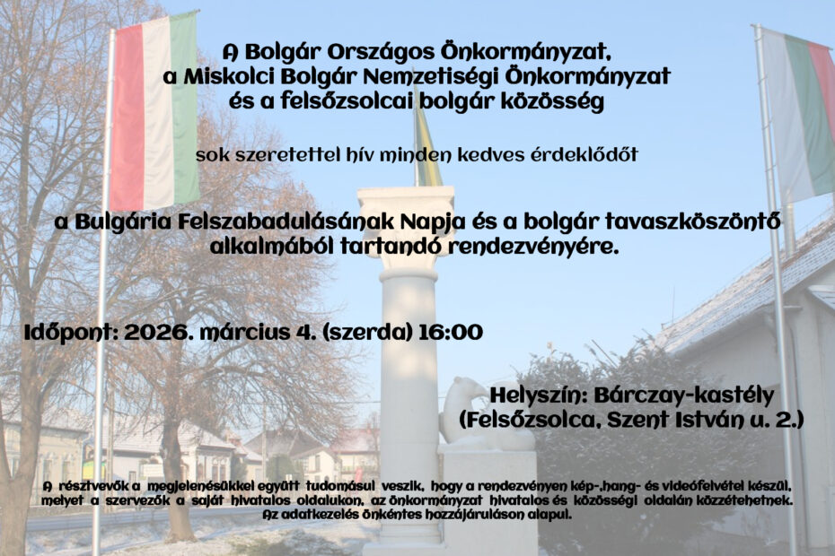 Bulgária Felszabadulásának Napja és a bolgár tavaszköszöntő alkalmából a Bolgár Országos Önkormányzat, a Miskolci Bolgár Nemzetiségi Önkormányzat és a felsőzsolcai bolgár közösség tisztelettel meghívja az érdeklődőket 2026. március 4-én, szerdán 16 órakor, a Bárczay-kastély udvarán tartandó, koszorúzással egybekötött ünnepi megemlékezésre.