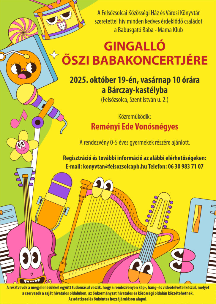 A Felsőzsolcai Közösségi Ház és Városi Könyvtár szeretettel hívja a kisgyermekes családokat a Babusgató Baba – Mama Klub Gingalló Őszi Babakoncertjére, amelyet 2025. október 19-én, vasárnap 10 órától tartanak a Bárczay-kastélyban.