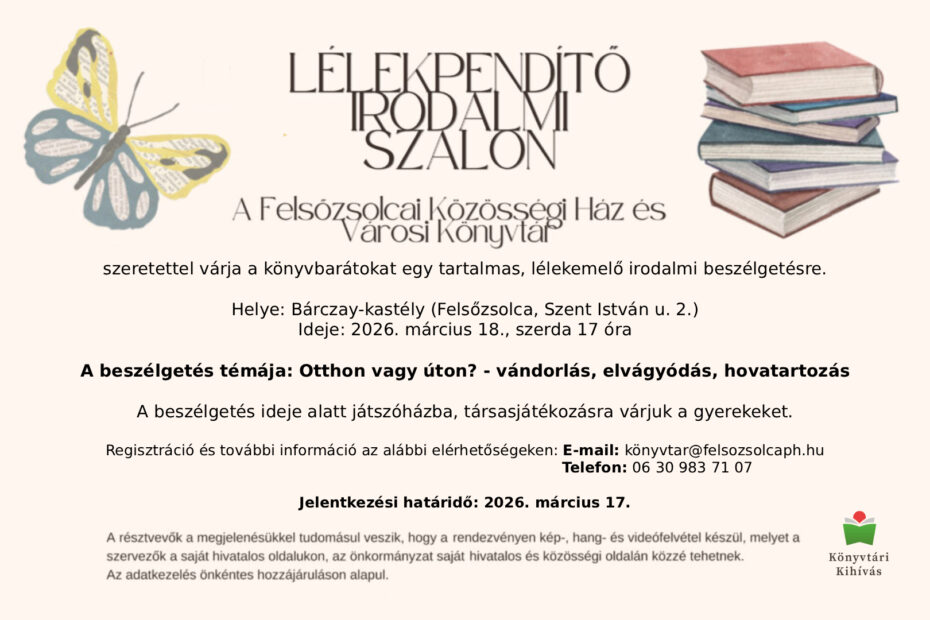 A Felsőzsolcai Közösségi Ház és Városi Könyvtár szeretettel várja a könyvbarátokat egy tartalmas, lélekemelő irodalmi beszélgetésre, 2026. március 18-án, szerdán 17 órakor a Bárczay-kastélyba, melynek témája: Otthon vagy úton? – vándorlás, elvágyódás, hovatartozás.